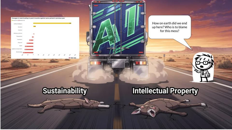 In the presentation I'm making the case that AI is a massively overhyped California goldrush, that the economic impact currently seen stems primarily from the reconfiguration of intellectual property and that the technology narratives serve as a massive smokescreen to obscure and prevent action against the value redistribution that goes alongside the centralisation of knowedge and loss of scarcity in the knowledge economy.