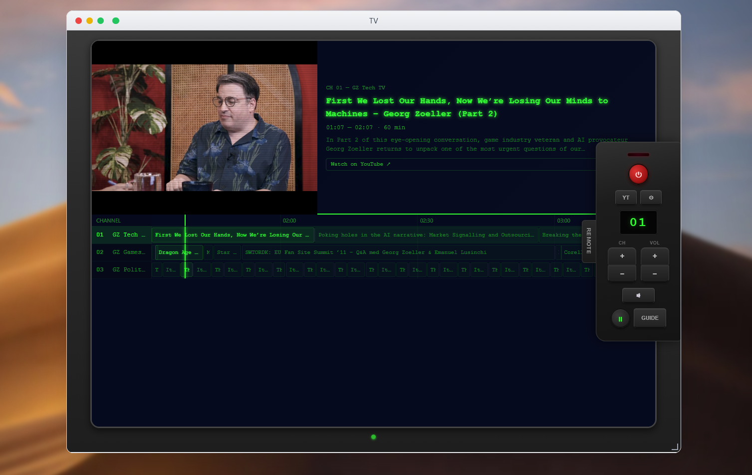 This inspired me to add a similar, RetroTV app to This Is Fine OS, filled with various youtube videos accumulated over my work in Tech and Gaming.