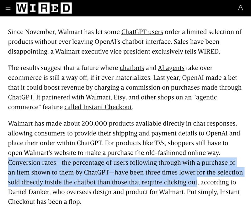Chat commerce was always a cludge, even before OpenAI used it as a fundraising narrative last year. ### The history of chat commerce It became big when Facebook and friends launched live streaming which created a massive live commerce segment - in some Asian countries approaching transaction volume amounting to single digit of GDP. Night market stalls now streamed their product When live commerce appeared, platforms had no commerce tooling at all, so messaging the creator was the only way of getting a transaction done. It was “unstructured” Clever and hungry Growth VP types - at constant war with other VPs of other surfaces for headcount, the metric gating promotion to higher VP ranks - instantly realized this was a career defining opportunity - using the old “the data shows the demand” they got approval to kick off international efforts to “capture” this transaction volume. But if you worked in Big Tech at any point, you understand products that fall between VPs - like Messaging vs Commerce vs Payments vs Live/Feed are hell precisely because of politics, VP competition, bell curve ratings and priorities. You avoid them like hell because if your number one priority is someone else’s number 3, them de-prioritizing your product kills your chance to deliver and with it puts you at risk of not meeting goals, which, for some jobs like engineers, can wash you out of the company. For example, adding a buy button to Live Streaming would be a superior solution, but the result could be loss of feed time (people who buy stop shopping), so you’d hurt your own “time in feed” goals team while helping the chat team get to meet their messages sent metric and the payment team, capturing the Total Payment Volume (TPV) with their goals. That means they’ll get headcount and promotions and GPU, likely from your budget. This gets worse when the top level areas are “between” top level VPs - like Payments and Messaging. Anyway, chat commerce kind of died for Big Tech as an area of interest because of execution and instead was captured by TikTok and smaller apps. Nevermind this though, the one lesson it should have taught the VPs, some of whom are now in charge of OpenAI commerce efforts, that shopping was the result of entertainment, an activity (watching live streams to hunt for deals, social interactions with sellers, etc). ### You don't beat hyper-optimized systems with new technology App based shopping is a maximally optimized experience, especially for companies like Walmart or Shein. A decade plus of solid genetic engineering, one a/b test at a time. This means the notion that somehow you could massively move the bar on core metrics by dropping in an LLM and entirely new paradigm was completely preposterous from the start and OpenAI’s defeat in both of its initiatives was totally predictable for anyone involved except hapless investors. It must have, at time of proposal, been apparent to OpenAI leadership, but I'm sure they enjoyed the free investor narrative and the opportunity to collect some premium observability data on Walmart's Checkout operation. Note: The author lead partnerships Engineering for Commerce and Payments and, at times Live Video, in APAC for a certain big tech.